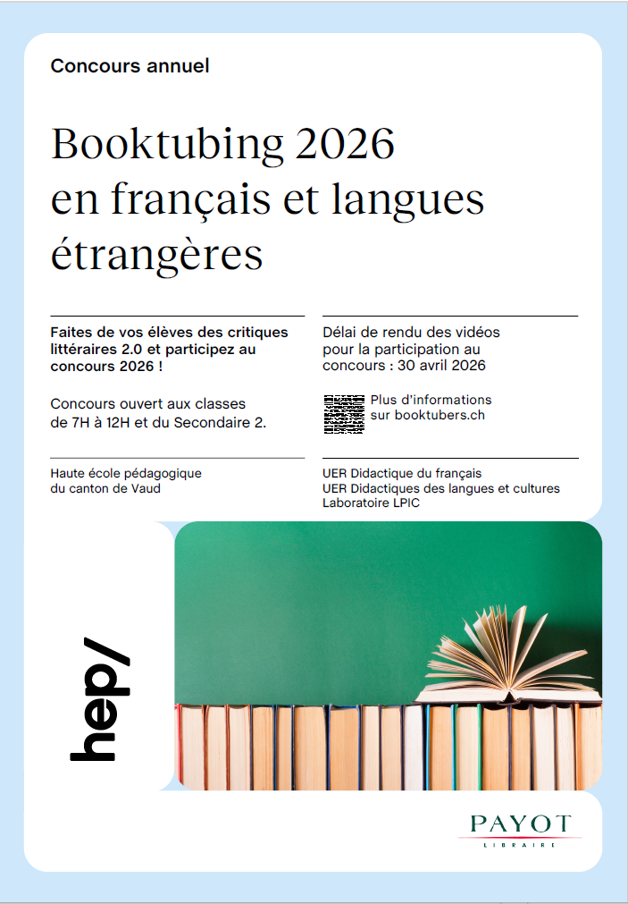 Porté par la HEP Vaud en collaboration avec la librairie Payot, le Booktube est un projet de publication de vidéos dans lesquelles des adolescents ou jeunes adultes partagent leur critique d’un livre. Lorsqu’il est mené en classe ou au sein de la bibliothèque scolaire, ce projet permet aux élèves de mobiliser plusieurs disciplines du Plan d’études romand (PER).