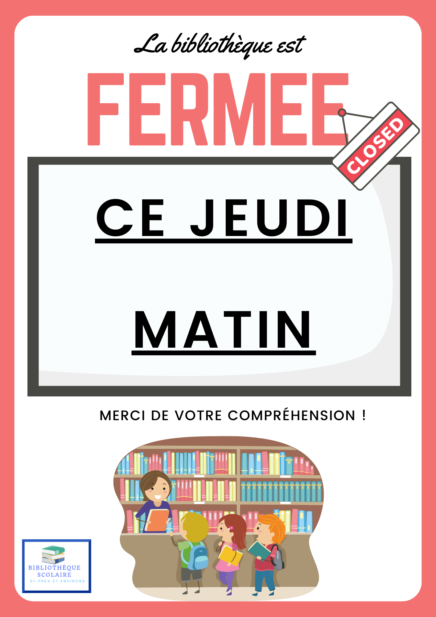 Nous sommes fermées durant la récréation et les vacances scolaires.